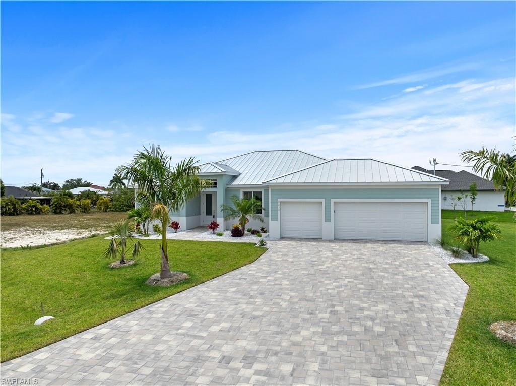 Brand New Construction POOL Home! ASSESSMENTS in and Paid! Southern Exposure GULF ACCESS Waterfront Pool Home located in super desirable SW Cape Coral! Southern Exposure for year-round sun. Home features nearly 2,100 square feet of living space, Great Room Floor Plan, 3 Bedrooms plus a Den, 3 Full Baths and 3 Car Garage. Large lanai with Outdoor Kitchen overlooking the Pool with sun ledge, water bowls and large sunning deck! Features also include Porcelain Tile throughout the entire home, Impact Windows, Doors and Sliders, Brick Paver Driveway and Pool Deck, Metal Roof, Wood Cabinetry with soft close doors and drawers, Double Tray Ceiling in Living area with Crown Molding, Stone Accent Wall with Electric Fireplace, Stainless Steel Appliances, Large Pantry, Laundry Tub with upper Laundry Cabinets for additional storage. Oversized Corner Lot with a Fenced Large backyard! Centrally located in SW Cape Coral near shops, restaurants, Marinas, and plenty of Biking and Walking paths! The home has just been completed and will be ready for occupancy soon! Start living the Florida lifestyle today!